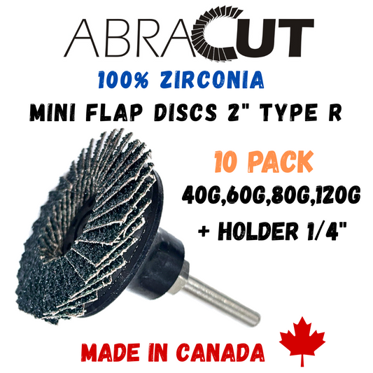 Canadian-Made ABRACUT Zirconia Mini Flap Discs 2" Type R, 10-Pack Mixed Grits 40/60/80/120 Grit, Made in Canada with Holder 1/4" for die Grinder